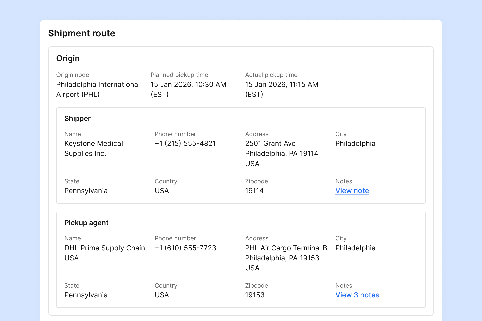 Routes, contacts, timestamps, all flattened into the same label-value grid.