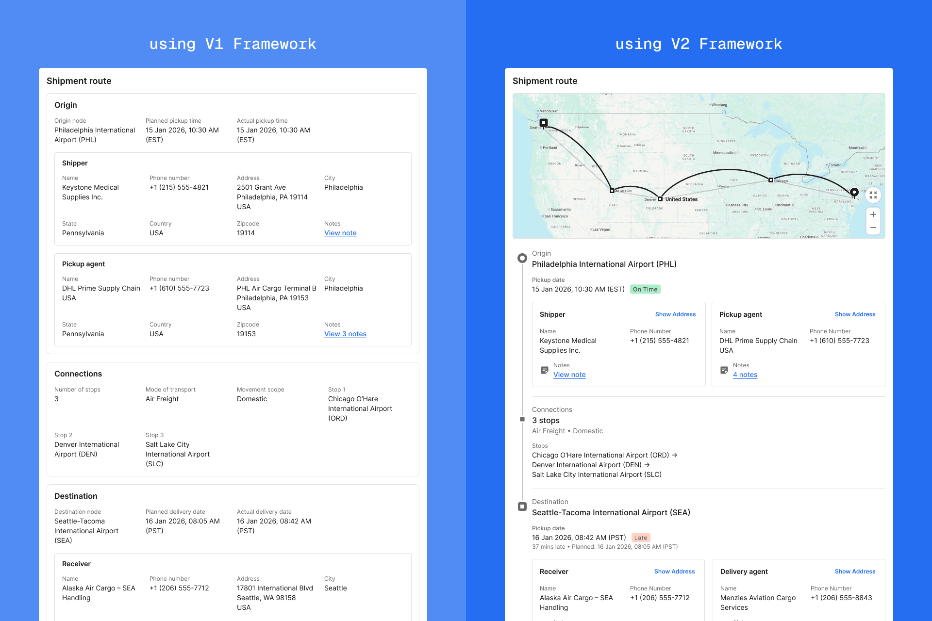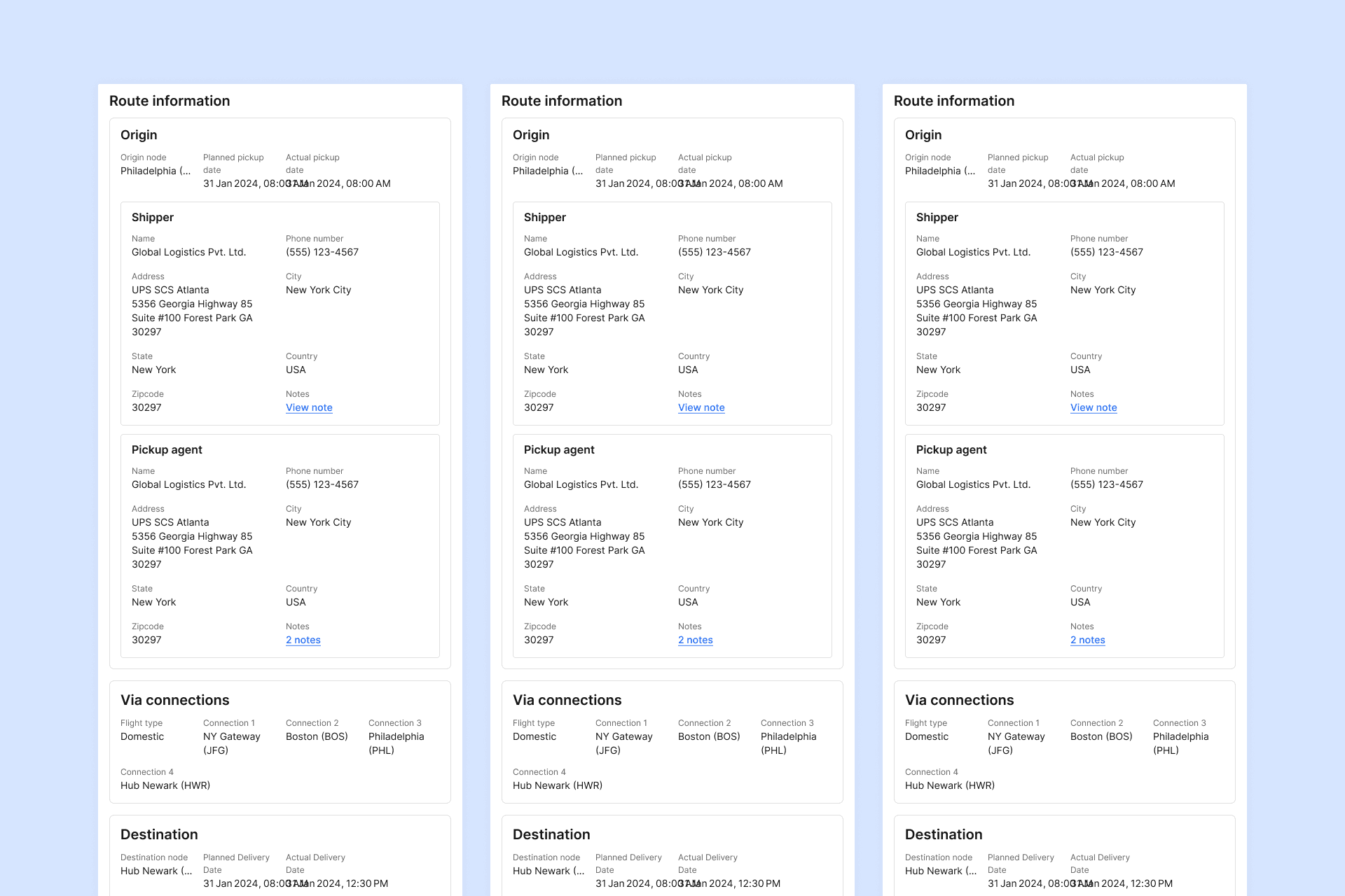 Operations teams use them to assess delays, trace routes, and identify downstream impact, all under time pressure. In some teams, a coordinator checks a detail page 40-50 times a day. Every extra second spent parsing compounds across hundreds of decisions. A wrong call means a missed SLA, a fleet re-routed mid-day, or a client escalation that puts the contract at risk.