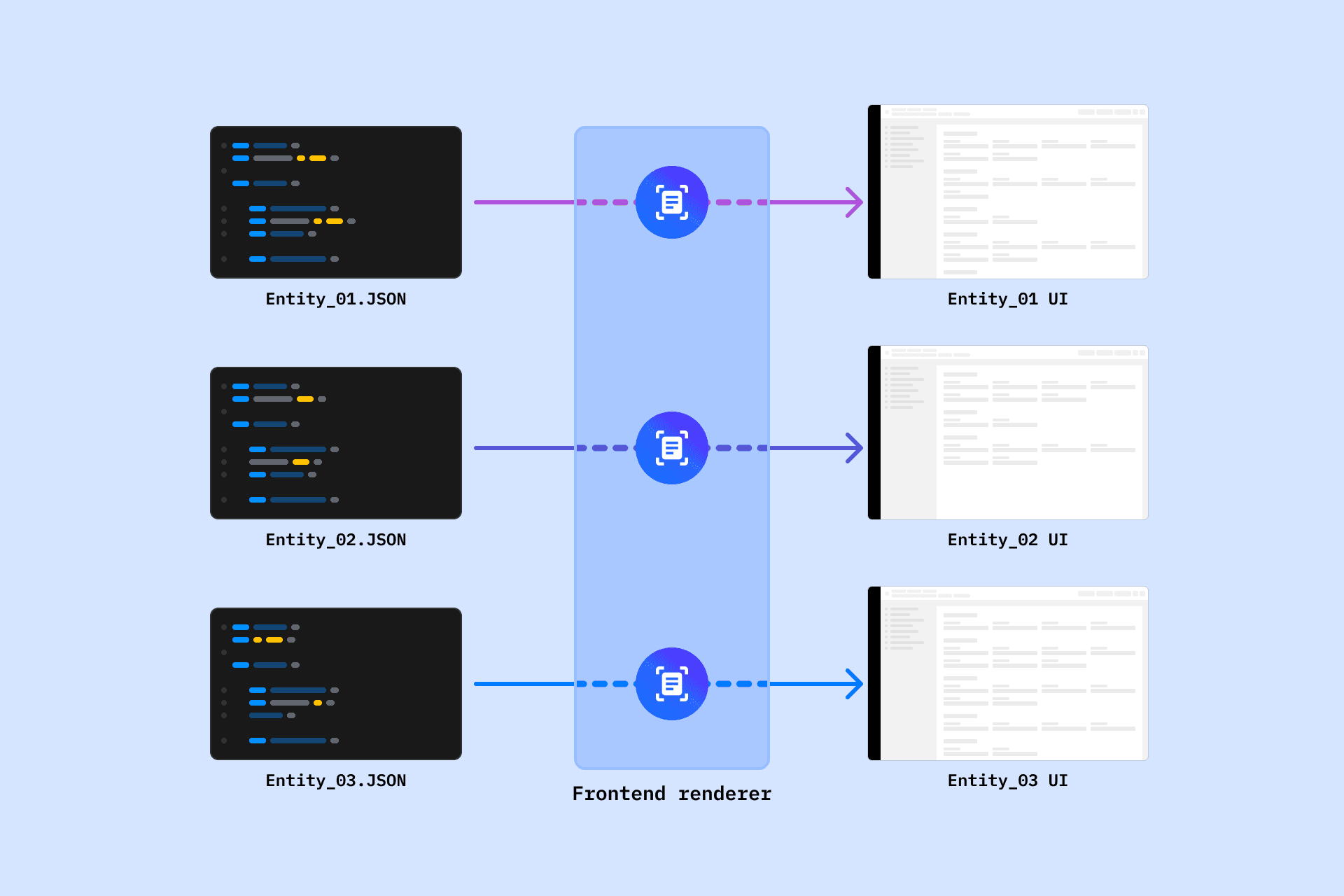 All UI must render from backend schemas. No custom frontend logic per entity.