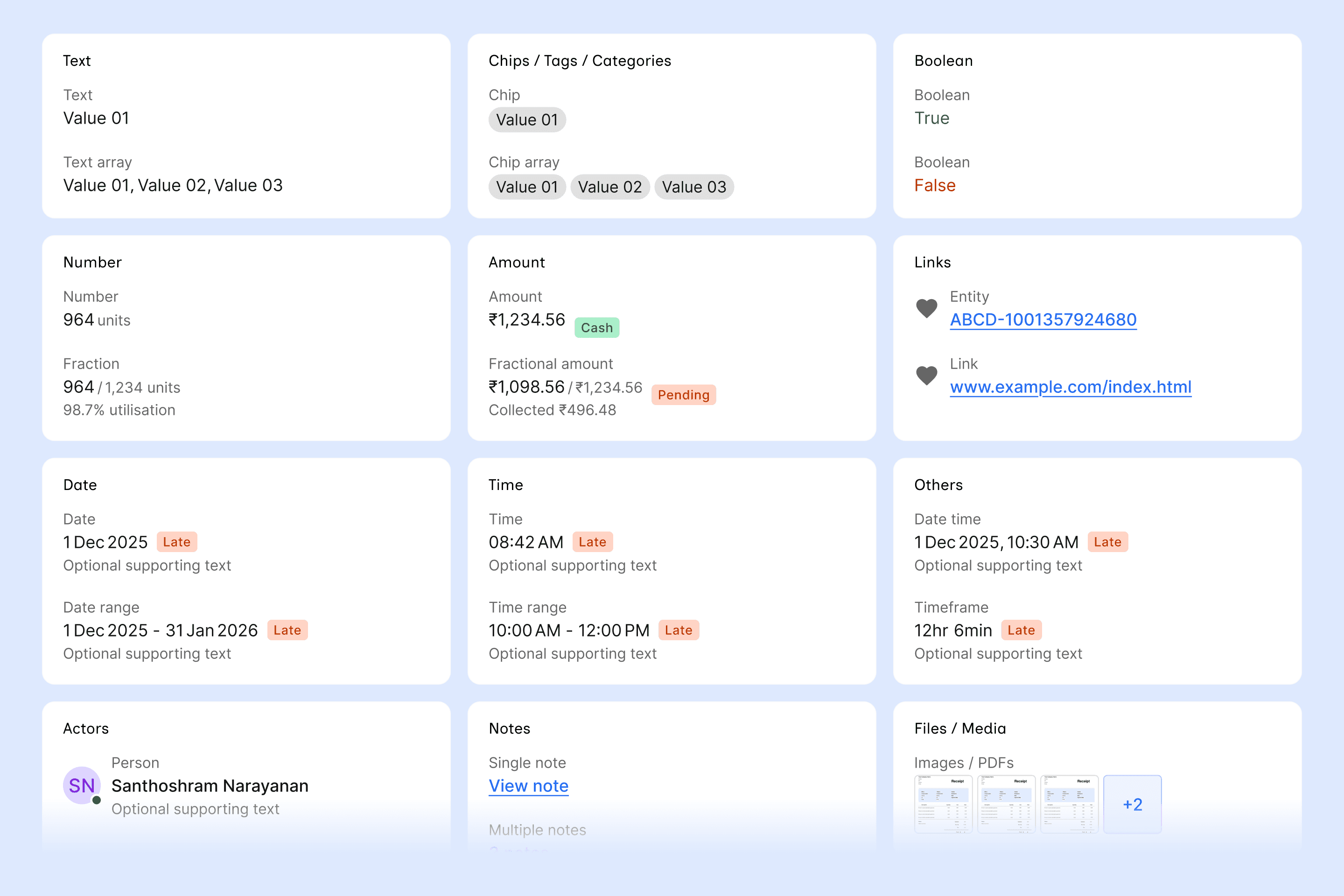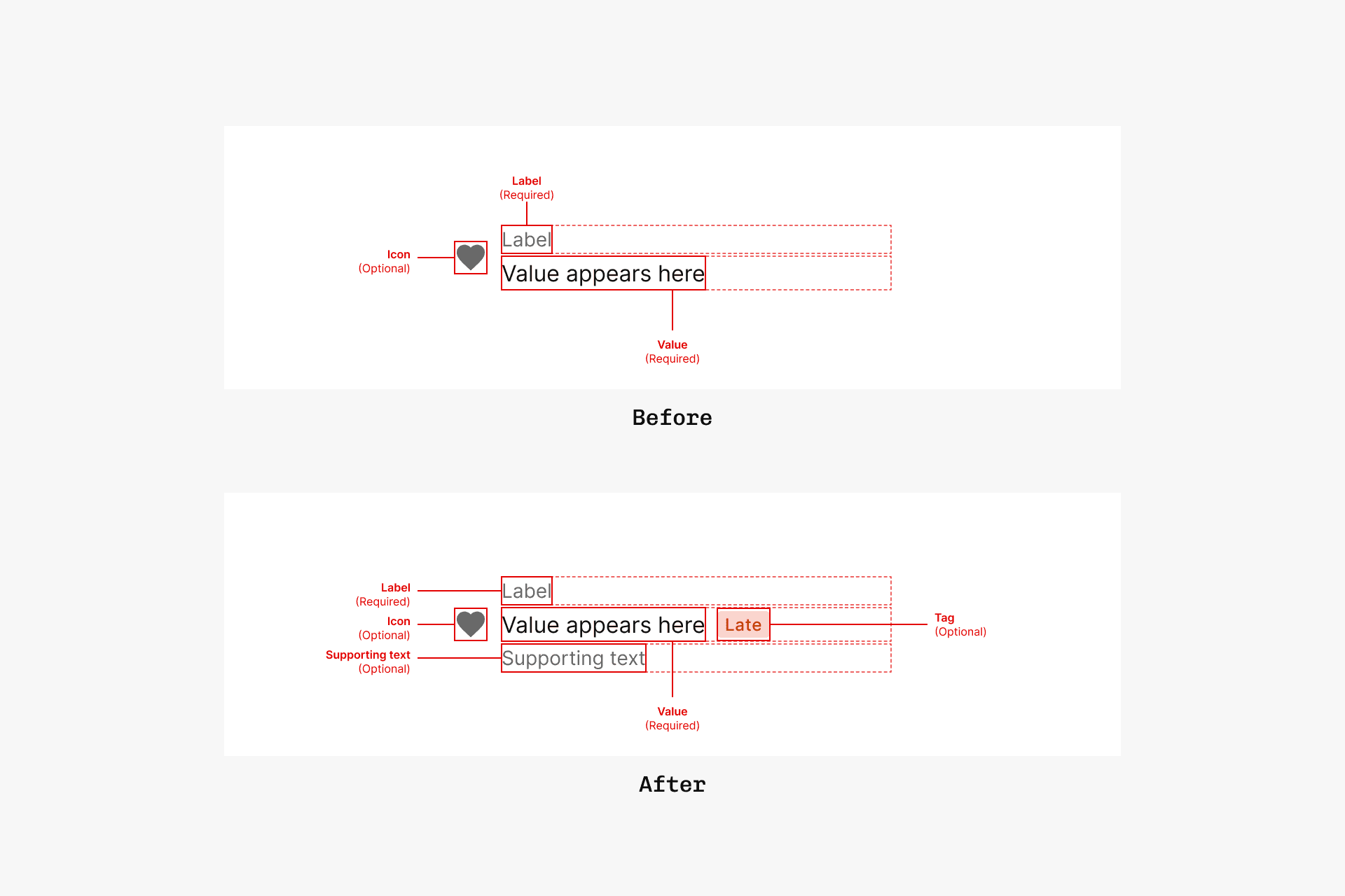 I applied the same principle at the atomic level. I redesigned the label-value pair itself to carry meaning. Optional tags, icons, and supporting text turned individual data points into self-explanatory units.