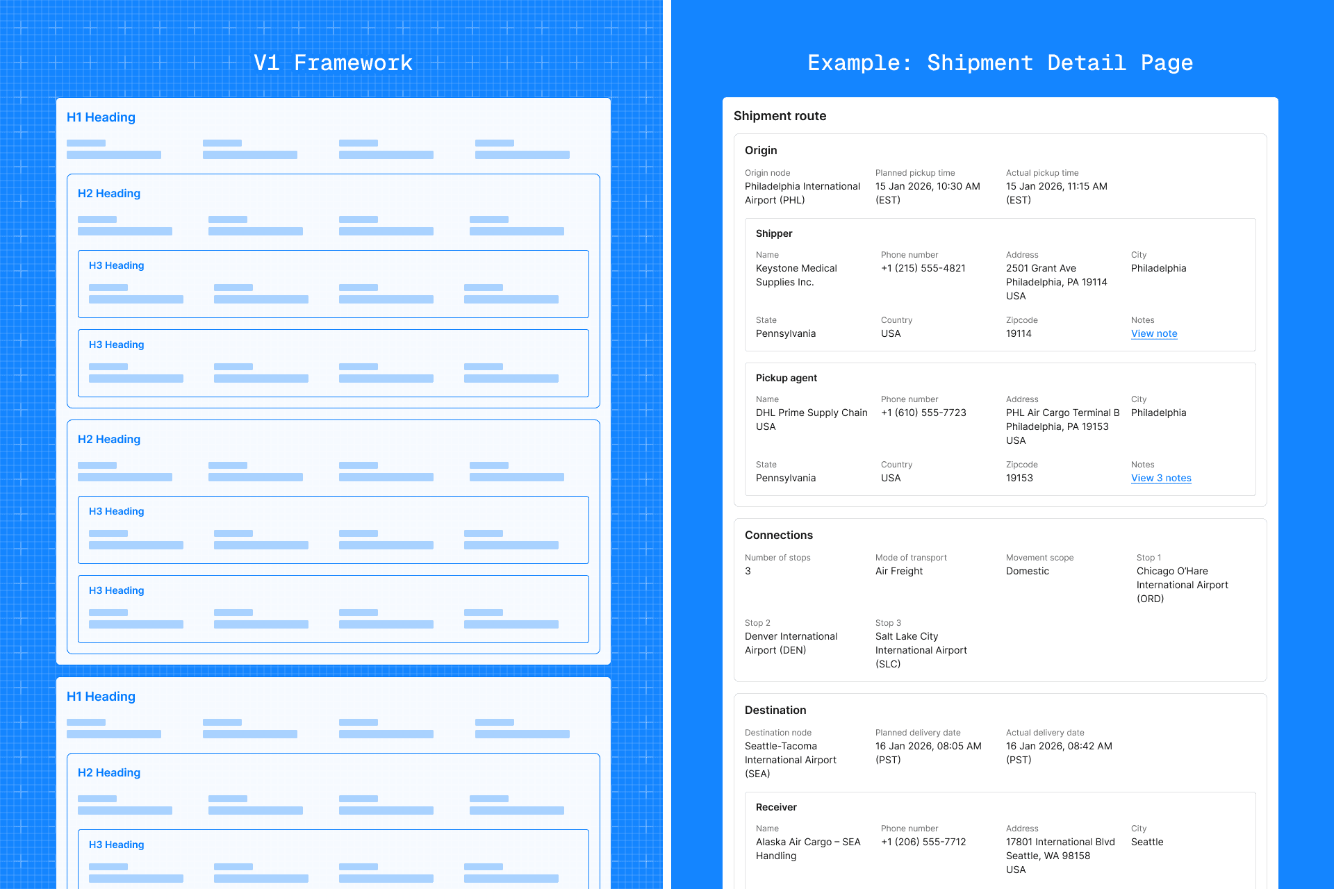 Using this framework, we designed detail pages for 14 entity types. Three anchor entities (shipments, orders, and tours) were designed at full depth to validate real-world complexity. The rest were validated structurally to ensure the framework handled diverse data models without breaking or requiring exceptions.